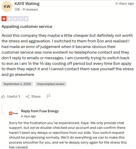 There are some poor reviews which is expected of all energy suppliers but it is good to see Fuse Energy actively responds to these types of complaints.
